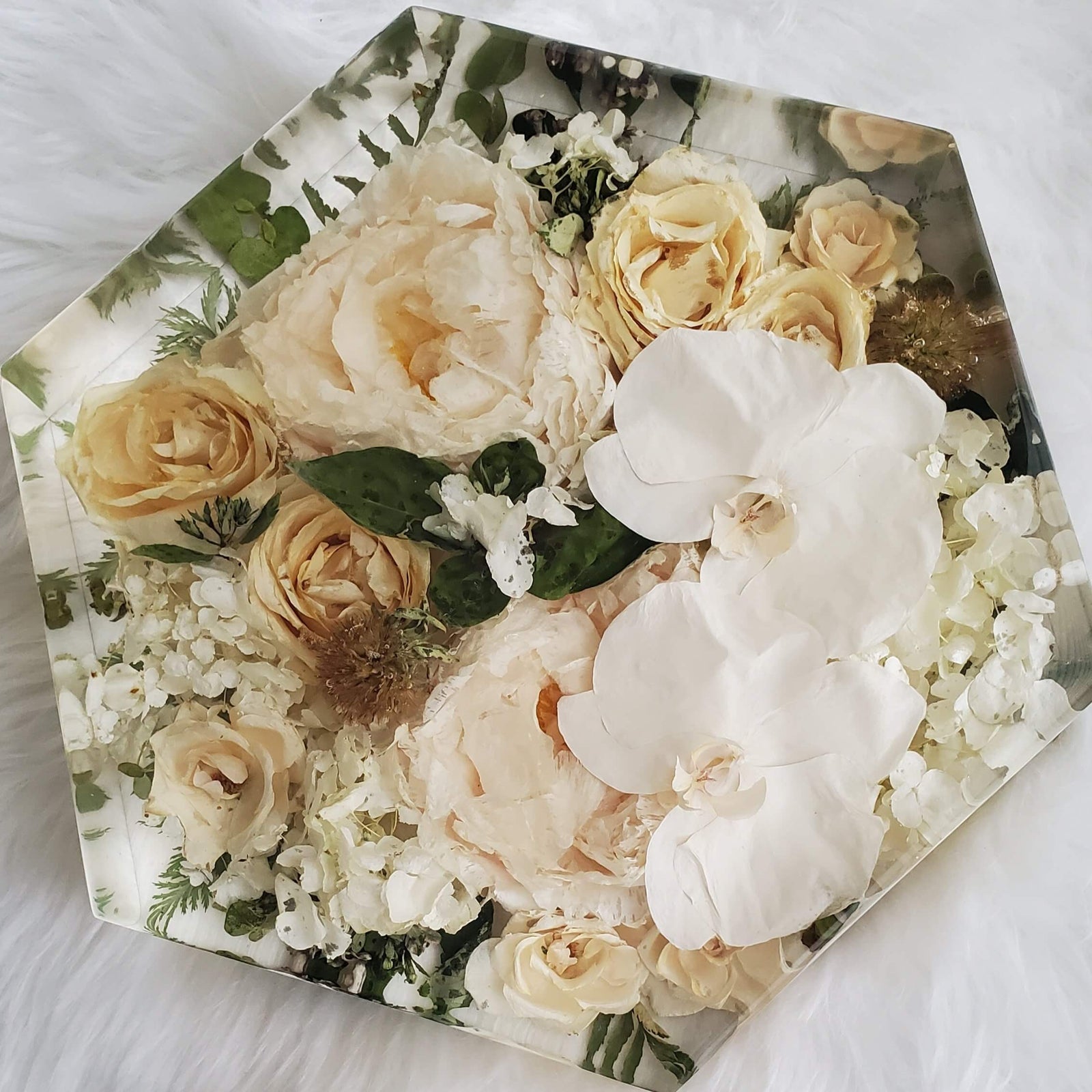 “This was the best purchase I ever made for my wedding. I've always wanted to preserve my flowers some kind of way and I'm just so grateful to have such a beautiful piece of artwork to commemorate the day. The tray I ordered was absolutely beautiful and perfect. The owner made sure it was everything I ever wanted and even dealt with all my tweaks, hopes, and dreams with such wonderful professionalism and I am just so thankful so have this piece in my hands ❤️ it is worth every penny and second of waiting. The product is such high quality and the customer service is TOP NOTCH! You will not regret this purchase."